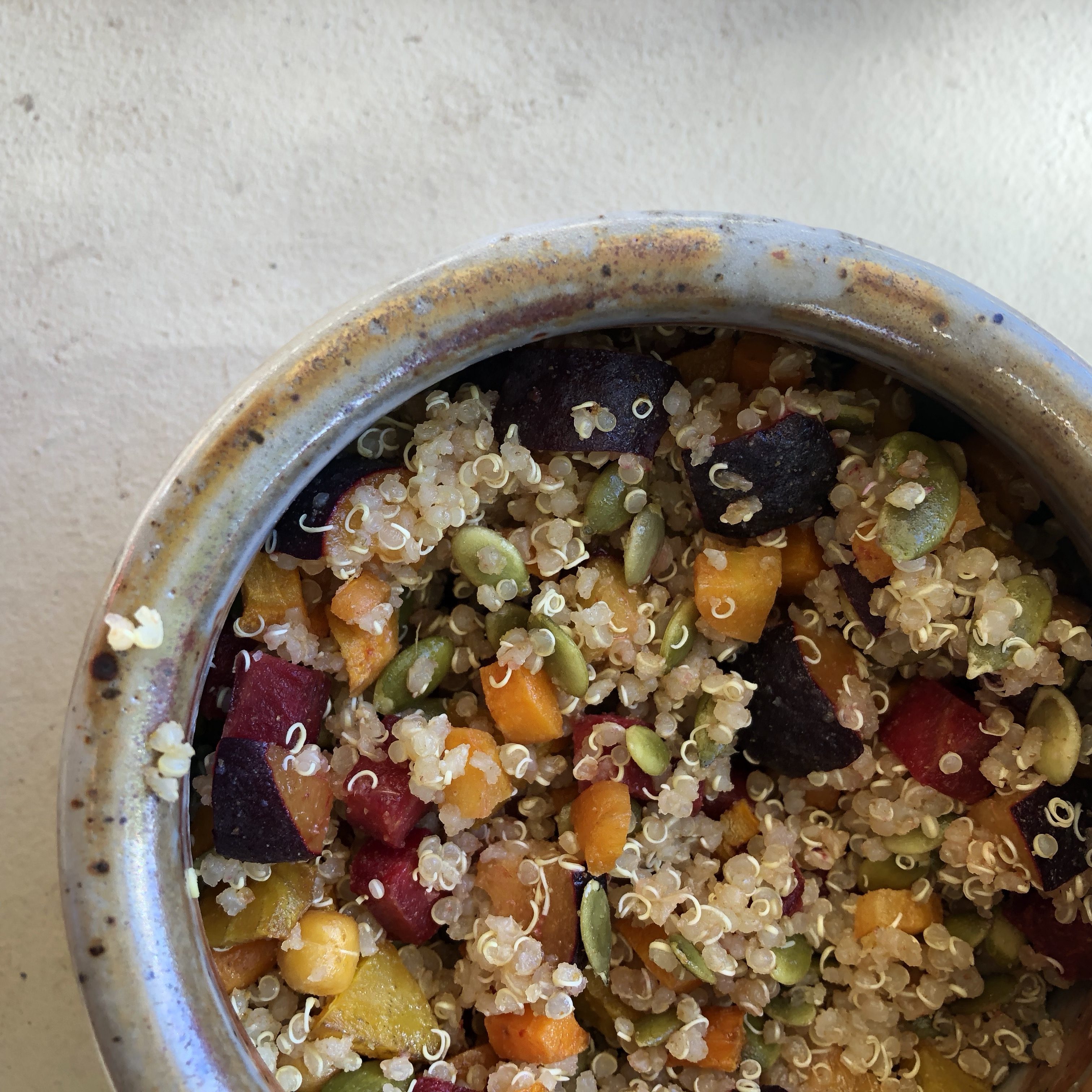 While it’s cooling, add the quinoa, tomatoes, and raisins to a large bowl. When the veggies are ready, add them in and stir well. Then add in the seeds/nuts. If you need a little more flavor, add in more spices, salt, and/or pepper.