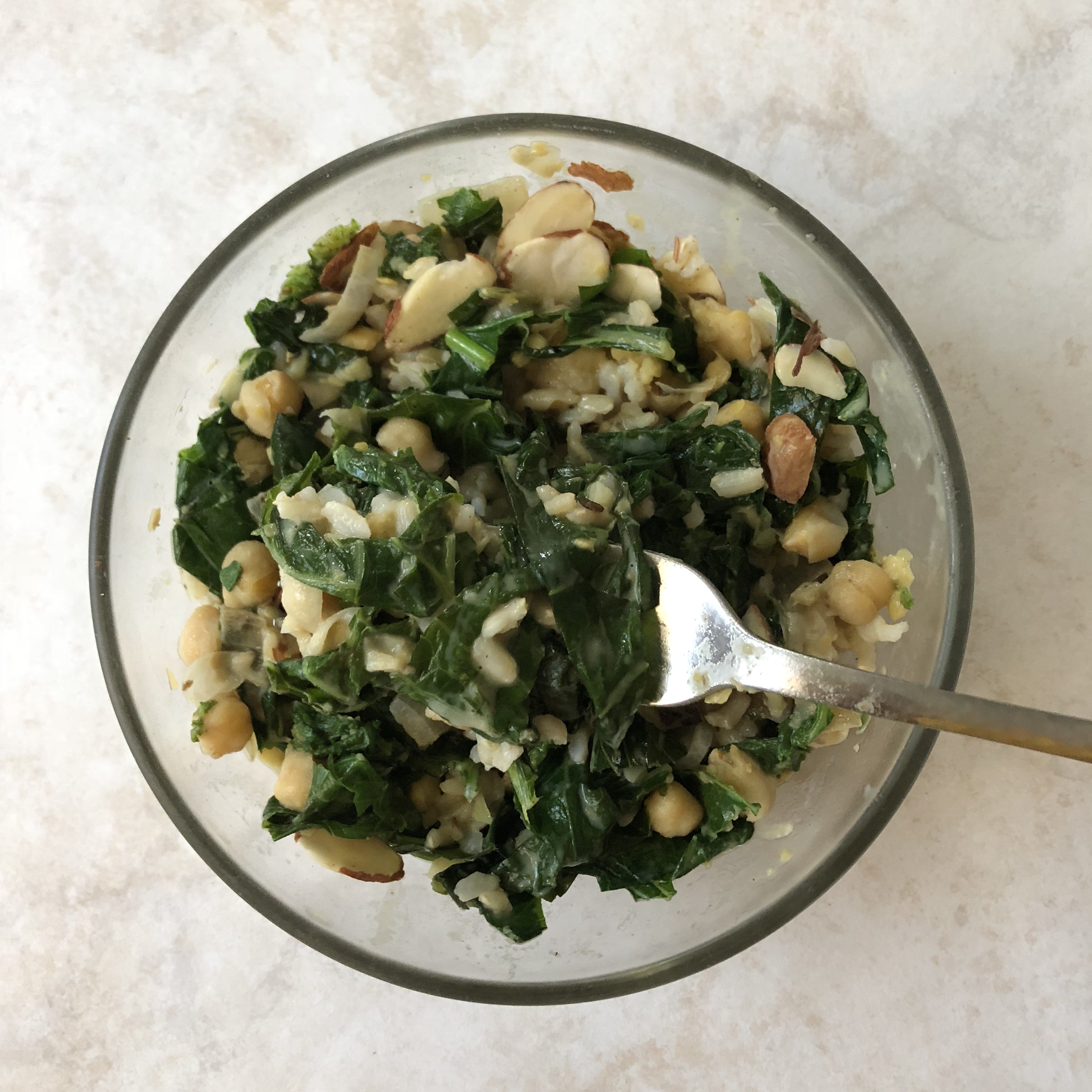 When the greens are ready, separate into 4 bowls with as much liquid as possible (over rice, if you want a more filling meal — your call). Add some slivered almonds for bonus crunch.