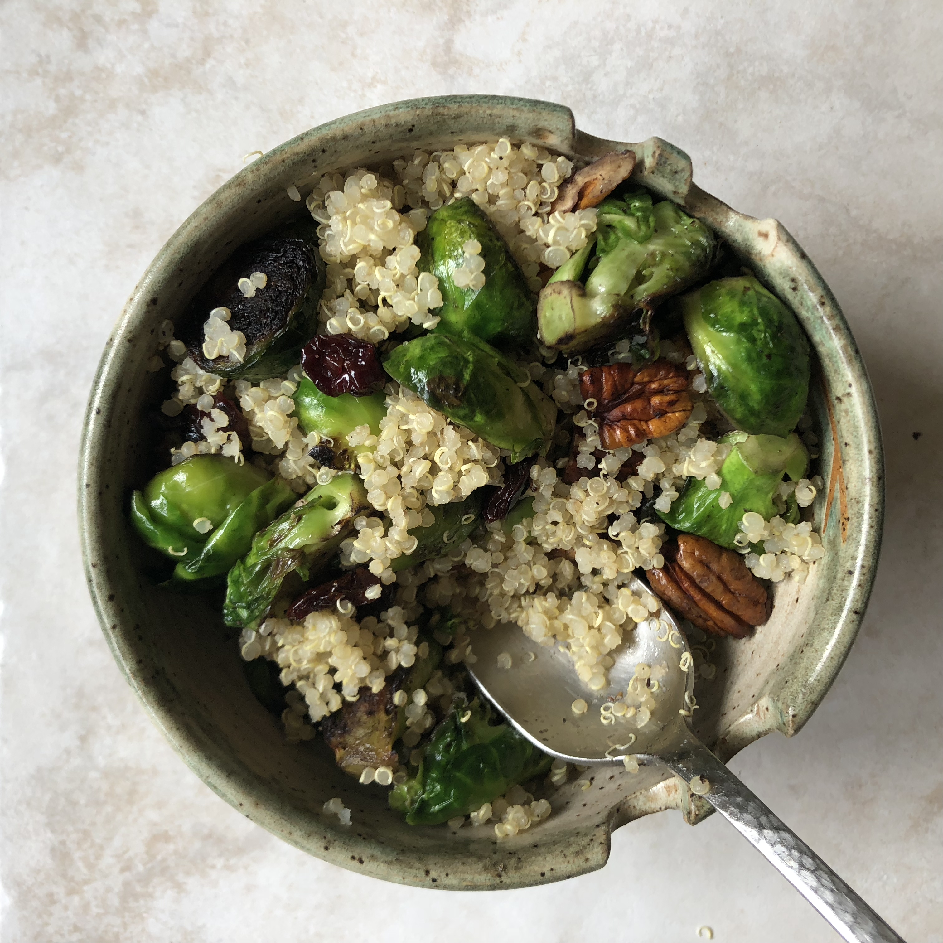 I also think the whole “balsamic and brussels spouts” situation is a little overdone, so I opted to avoid this combo. Instead, I used what we happen to have in abundance: pecans. We have several bags in our kitchen, thanks to my in-laws who have a thriving pecan orchard, and there’s only so much pecan pie I can make.