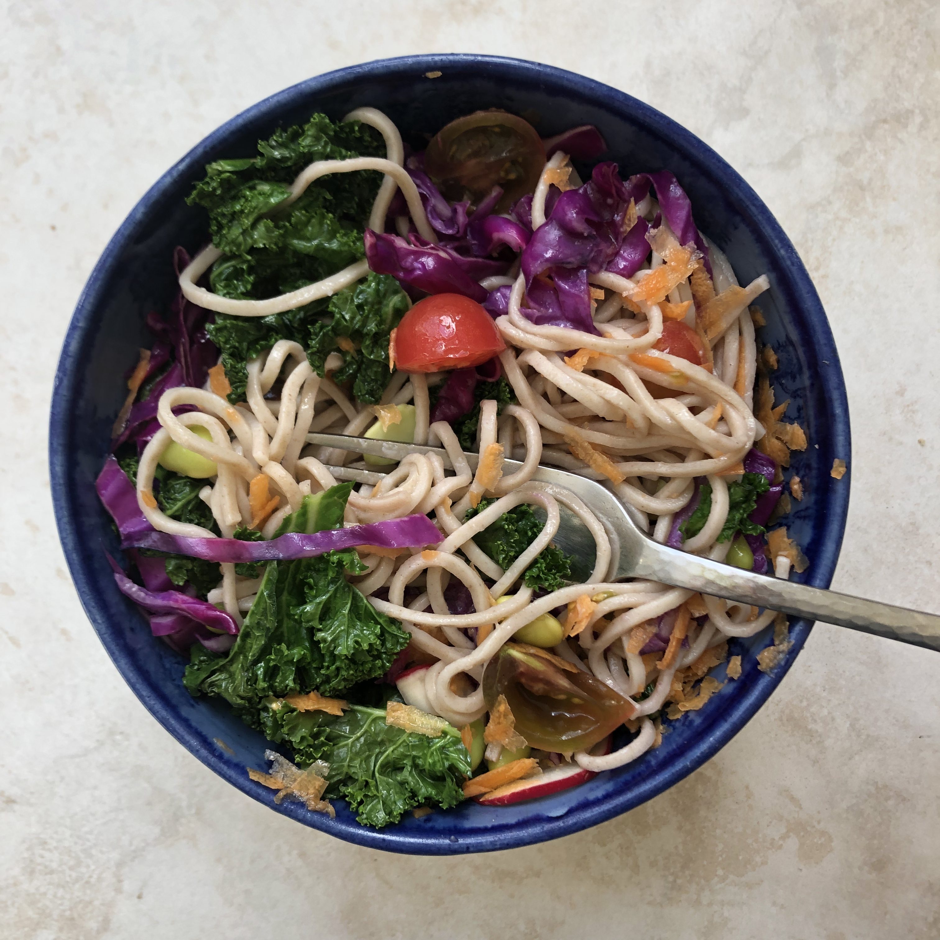 Add in the noodles, combining well with the kale/cabbage mixture. Then add in the edamame and tomatoes. Finally, shred the carrots directly on top (this is what I do although you can of course do this step earlier and just scoop them in!). Pour on some dressing and eat up!