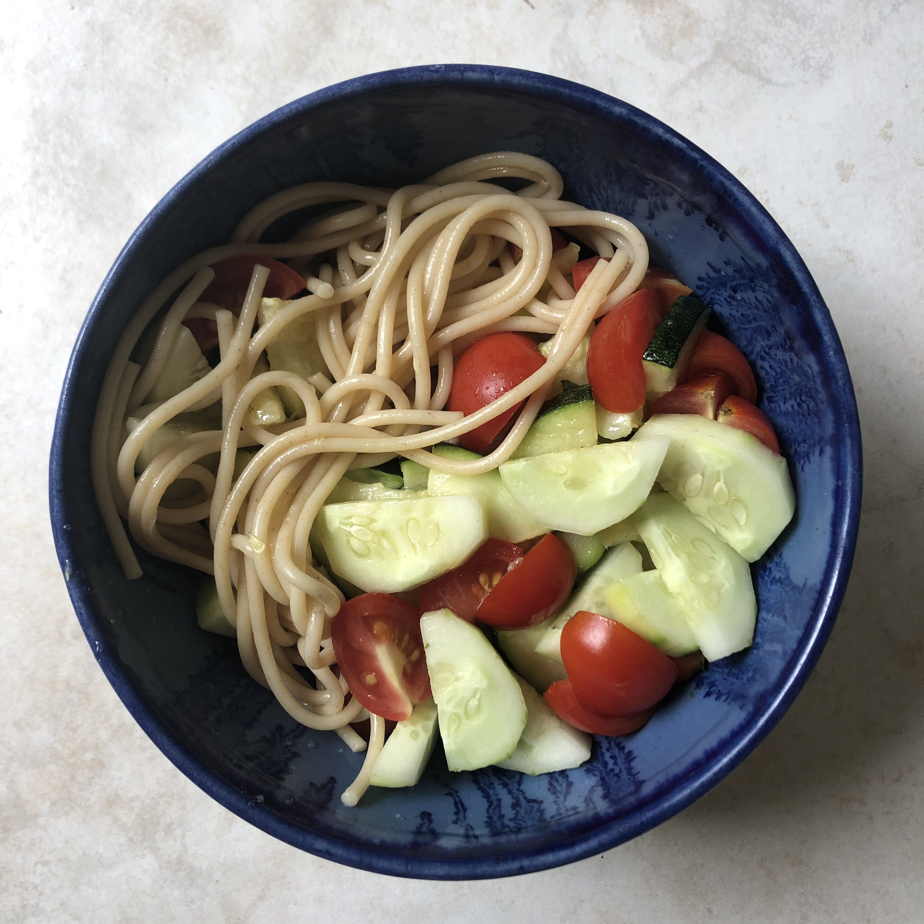 As for the veggies, I chose zucchini, cucumber, and cherry tomatoes. These 3 veggies go really well together and they are also in season at the same time. Hooray for seasonal eating!