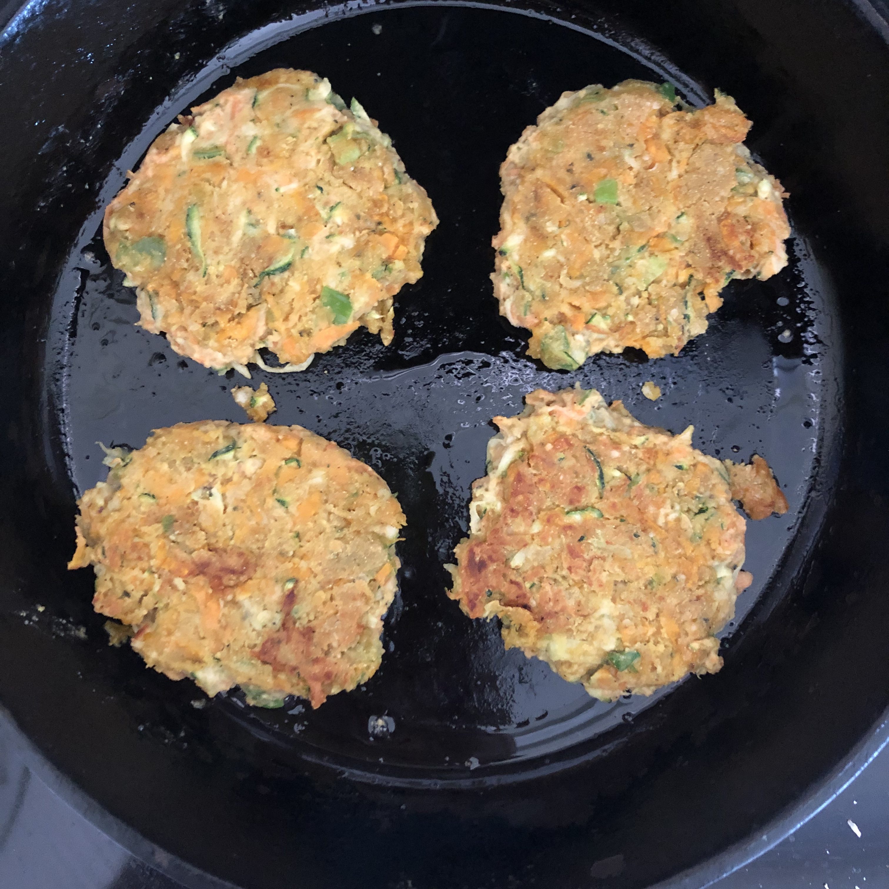 Heat some oil in a large frying pan. Scoop out 3 spoonfuls of the veggie/chickpea flour mixture (each spoonful would be about 2Tbs in size). Roll them into a ball, then place them in the pan. Squash them down a bit to flatten them and cook.